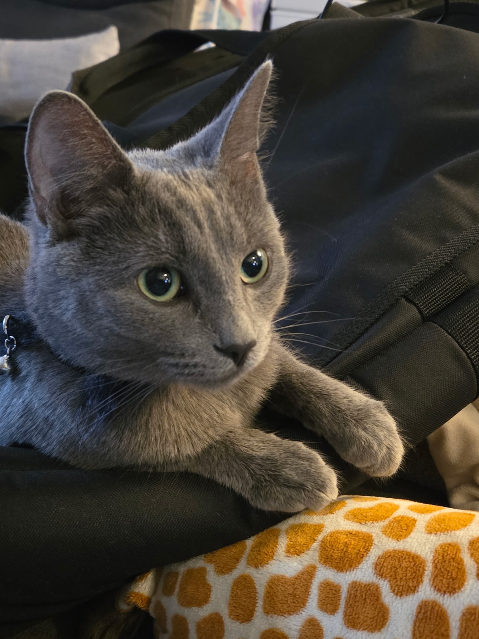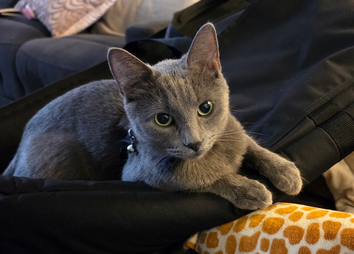 Amy is female and approx 2 years old. She’s fun, cutely mischievous, and full of both energy and sweet cuddles. She’s a vocal, extroverted morning bird with a vibrant and social personality. She likes to be a part of everything you do and likes leaving small objects in your shoes! Very social with other cats and caring towards her kittens. She’s long and slender, and has been a joy in her foster home. She would very much like to find her furrever home.