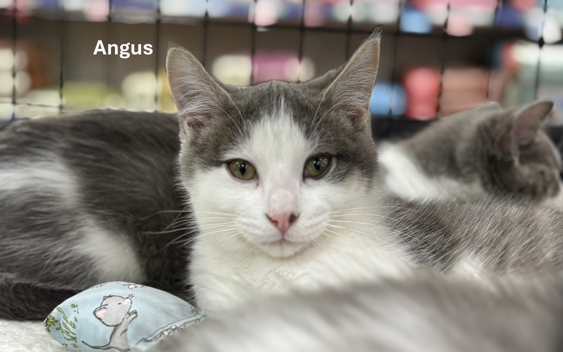 Born April 25, 2025 Angus (male, on the right) is a very sweet kitten who loves to play and climb the scratching post. Share on FacebookTweetFollow usSave