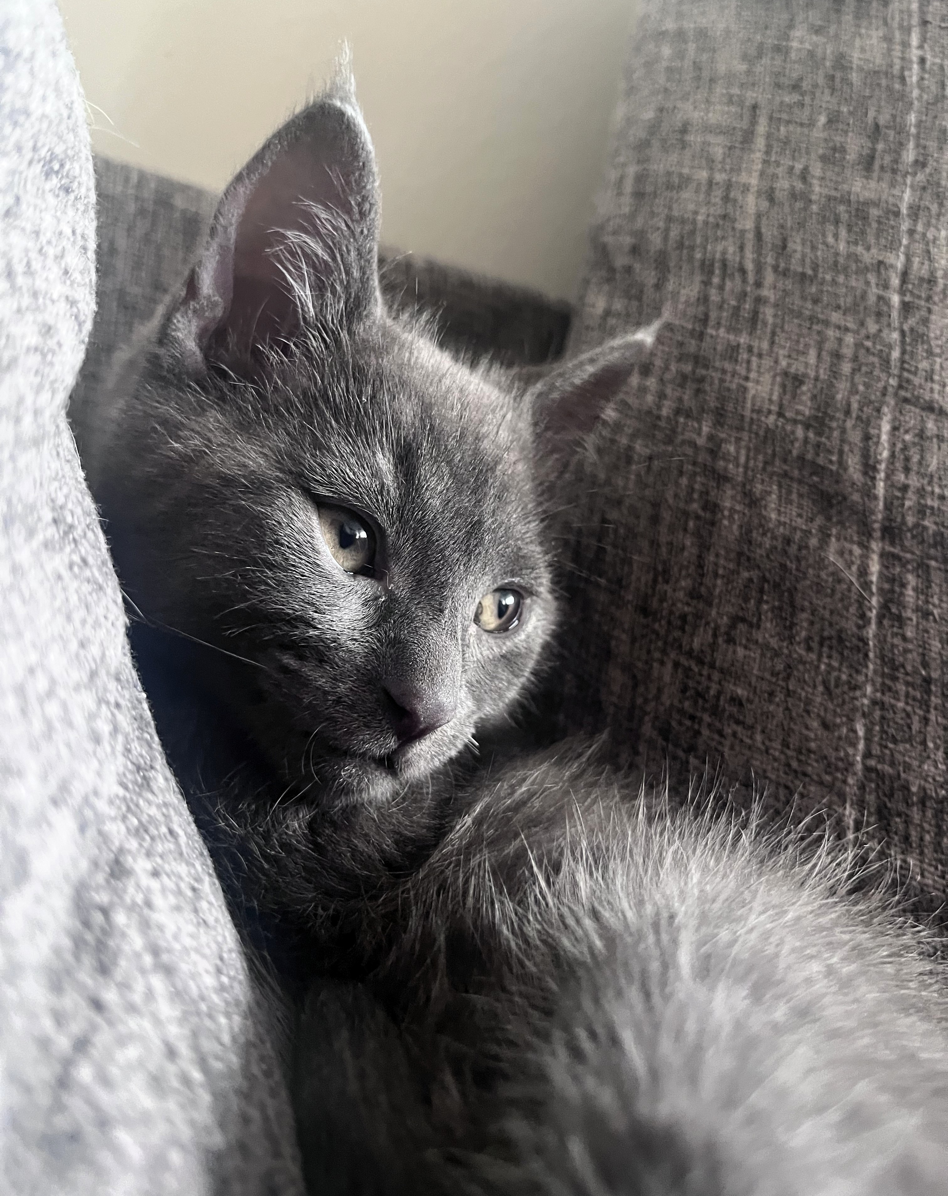 Rosebud is 4 weeks old now (as of Sept 6, 2025) and coming into his personality. He is learning how to play and is being introduced to new things every day. He is becoming more playful but loves to cuddle, running up to their foster mom and meowing whenever she comes in the room. He is a fuzzy grey but you can see some tabby pattern coming into his fur. He has been meeting the foster’s dog, cat, and niece in short spurts to help get him used to other animals and children.