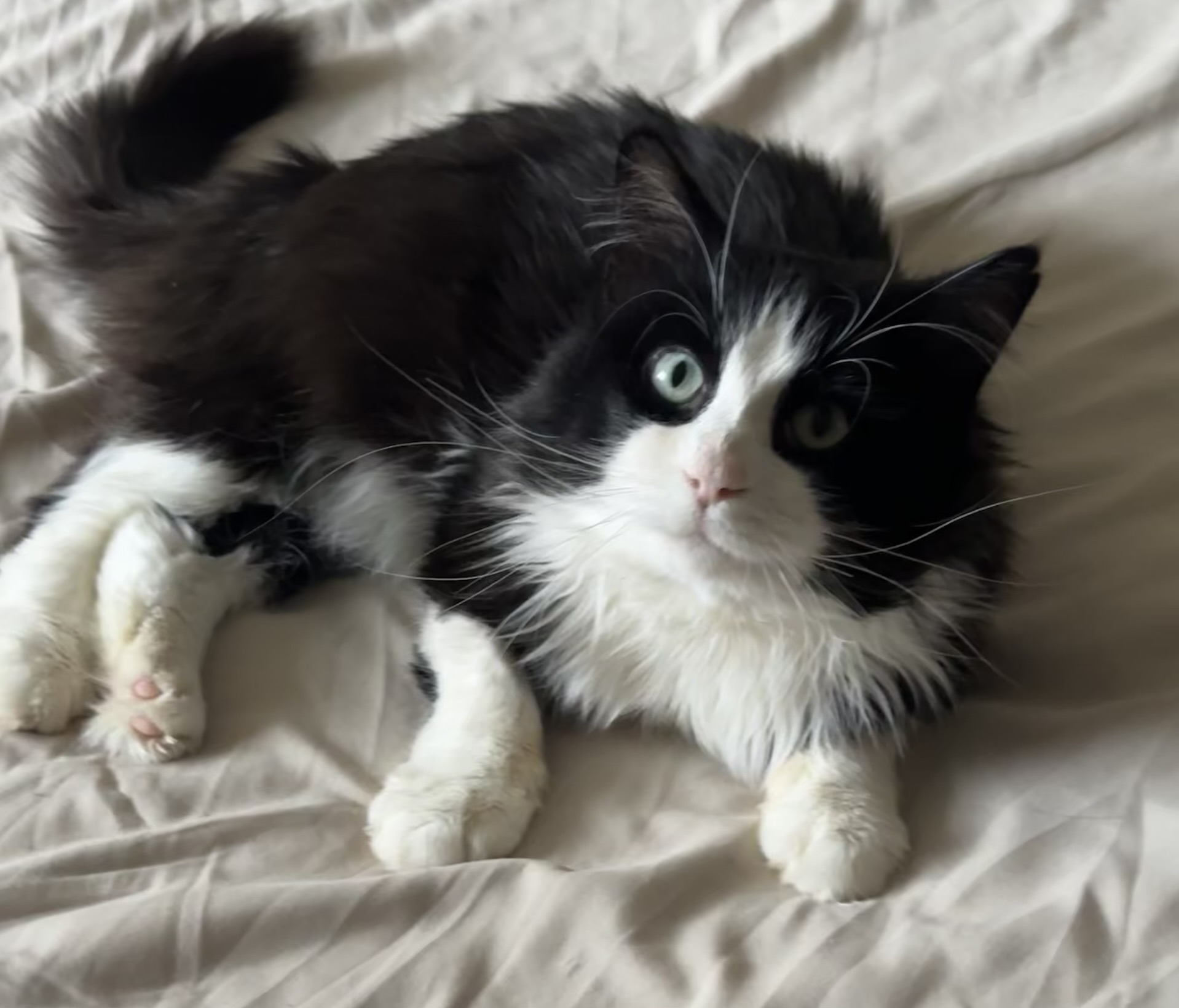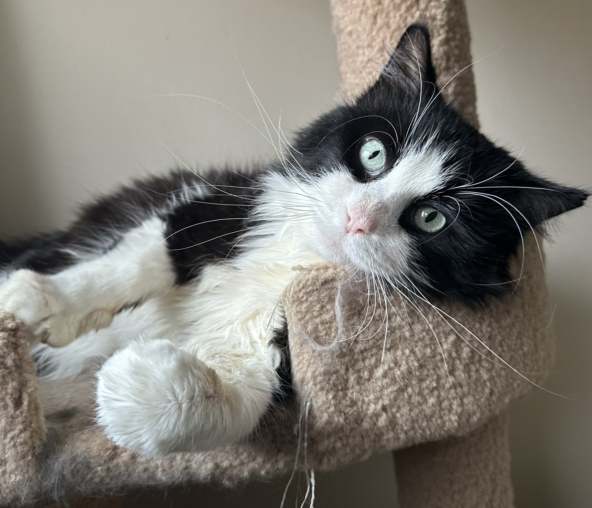 Date of Birth: October 1, 2022. Sylvester is a male black and white domestic medium haired cat. He’s extremely cuddly and affectionate. Very playful with occasional boosts of energy. He really just wants a human companion and a chest to lay on.